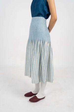 Everyday Indigo Stripe skirt with side godet details.