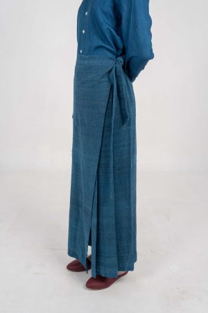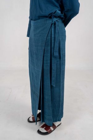 Companion Indigo Eri Silk pants with flap and tie-up detail.